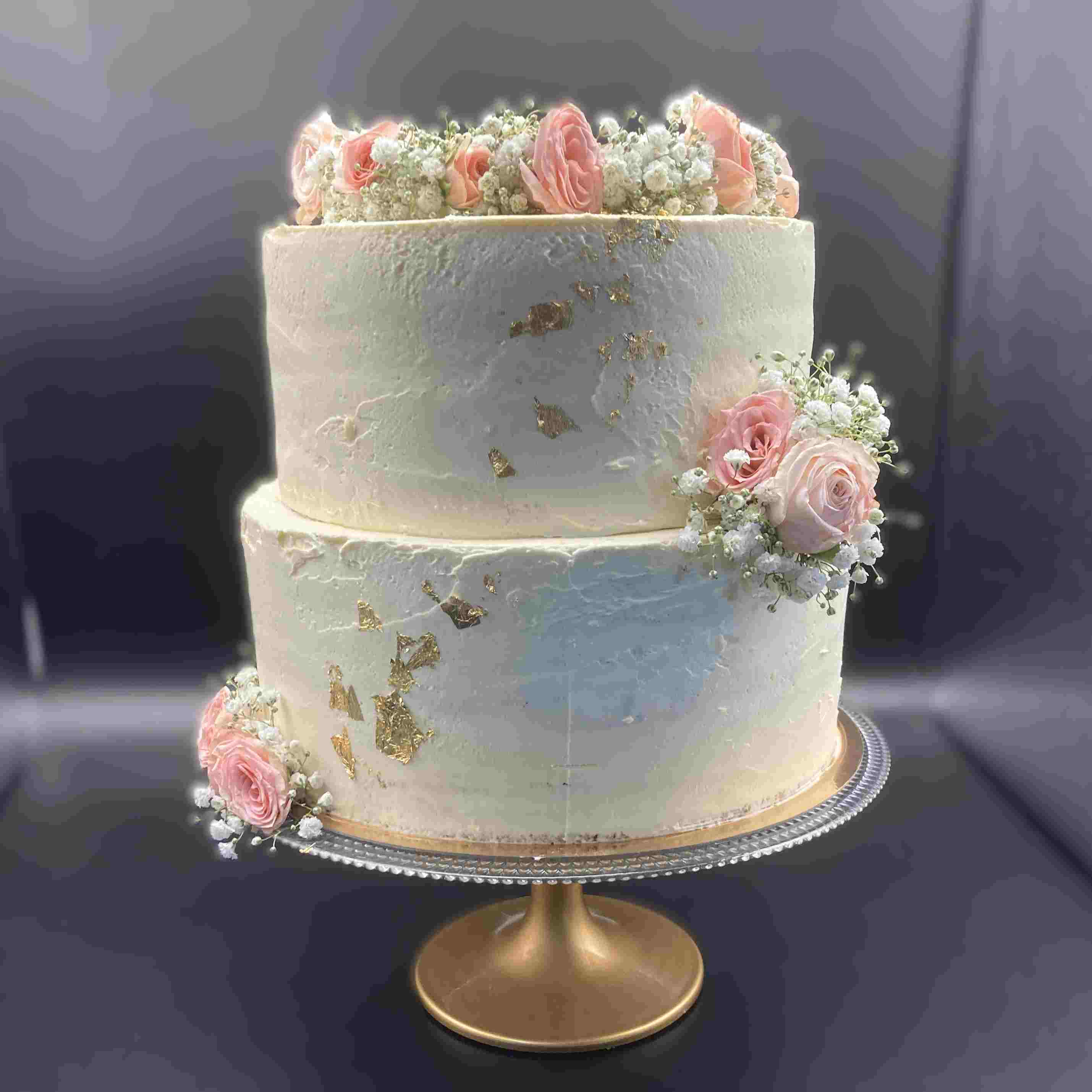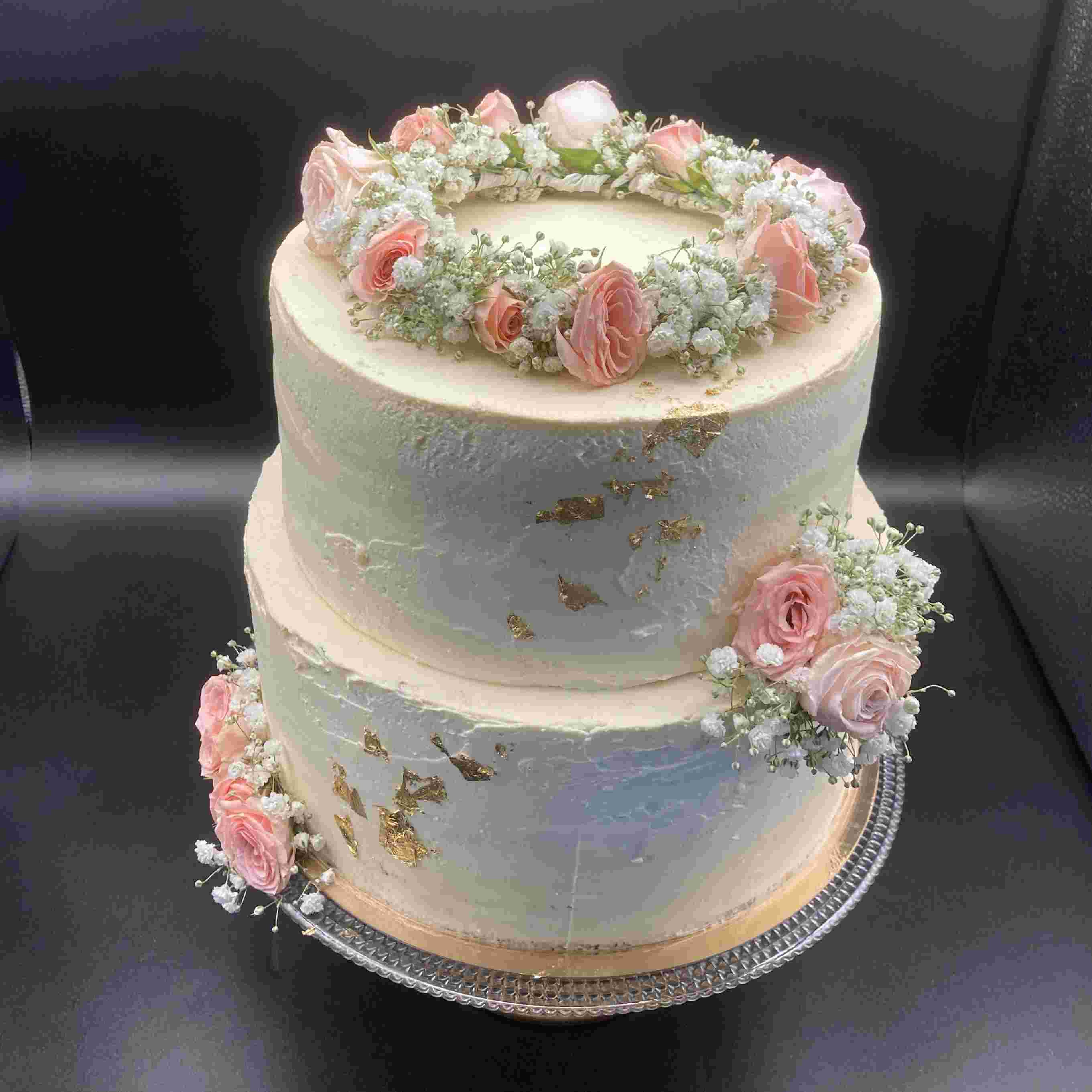 Hochzeitstorte zweistöckig, Durchmesser 24 und 20 cm, Tortenhöhe der einzelnen Stockwerke 10 cm - Dekor weiße Vintage Cake, eingestrichen mit weißer Schokocreme, lebender Blumenkranz und Blattgold