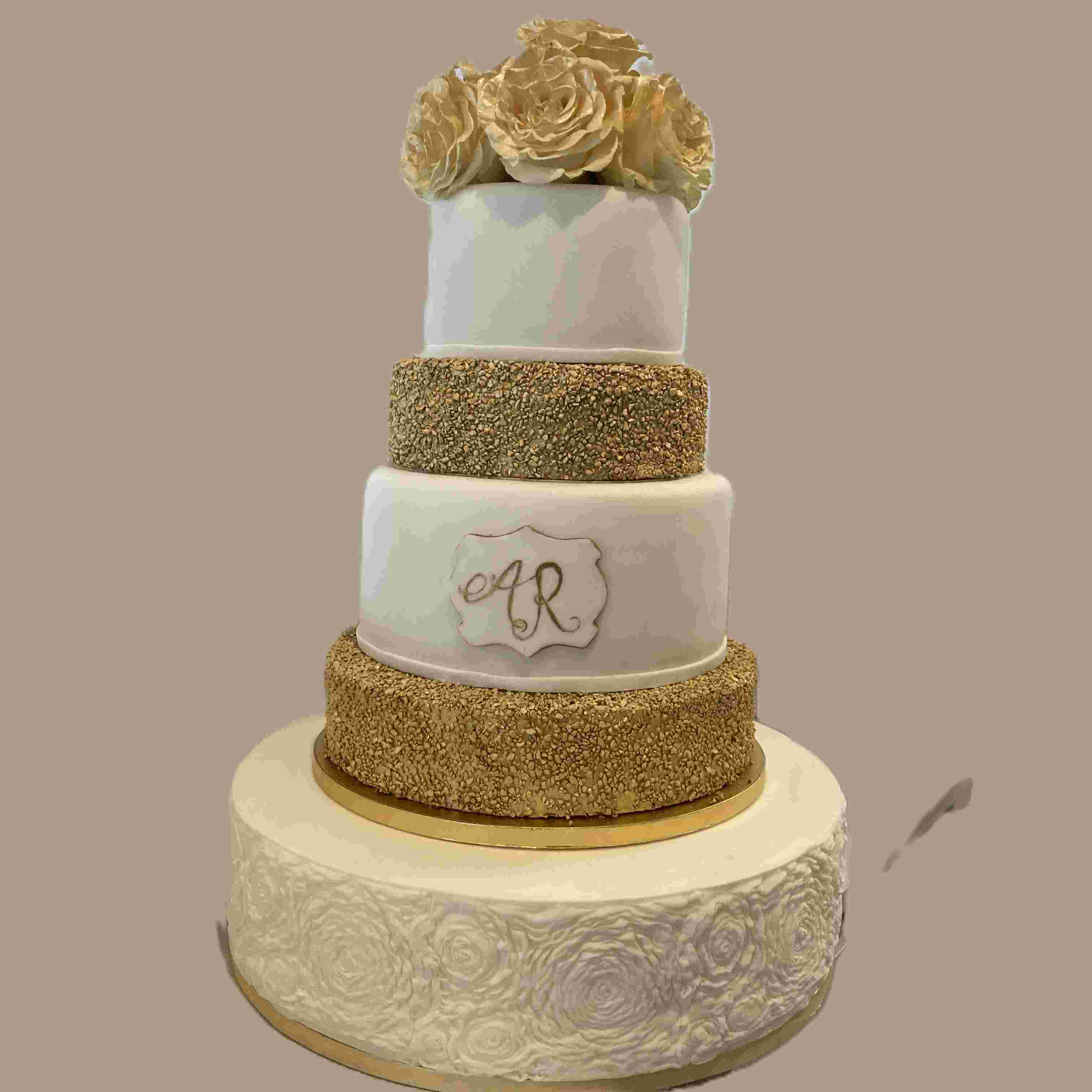 Dekor mit fondant eingedeckte Torte in ivory und gold, die niedrigen Stockwerke mit Goldflocken dekoriert, goldene Initialen handgemalt, als Topper lebende weiße Rosen mit Gold besprüht, als Tortenständer eine mit Ruffle-Roses eingedeckte Tortenattrappe, darauf die vierstöckige Torte.
